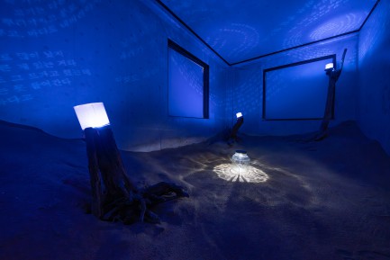 The glass bottles in the installation contain the women’s stories as messages in bottles floating in the vast sea. These bottles reach one room, a private and innermost place that represents the beach, a place where each body senses and drifts. This is the place covered with sand where Hae-soon lived, the artist lives, and we live together.