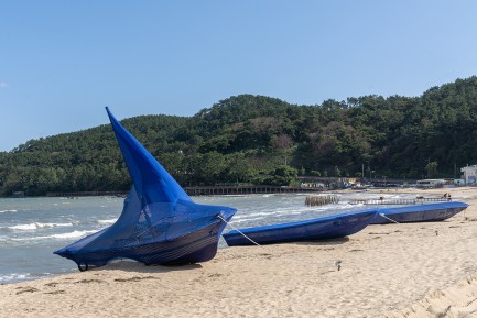 바다에서 배는 흔하고 익숙하며 명확하고 고유한 이름을 가진 사물이지만, 해안 지역에서는 거의 주목받지 않을 만큼 흔한 사물이다. 작업이 이루어진 일광은 ‘햇살을 가장 먼저 받는 곳’이라는 뜻에서 붙여진 지명이다. 빛과 어둠, 그 짧은 간극과 겹침의 시간에 푸른색 레이스로 감싸진 배는 어둠 속에서 명확한 존재와 의미를 잠시 내려 두고 또 다른 의미를 상상하게 하는 대상이 된다. 패턴이 있는 레이스로 배의 전체를 감싸는 것은 물체를 가리는 동시에 드러낸다. 마치 피부처럼 사물에 씌워진 레이스는 사물을 보이지 않게 하지만, 그 아래 우리가 보지 못했던 세밀한 부분을 오히려 드러내 보인다.