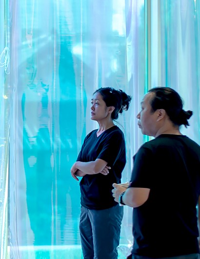 포레스트 커리큘럼은 남아시아와 동남아시아를 잇는 삼림지대 조미아의 자연문화를 통한 인류세 비평을 주로 연구합니다. 작품 유랑하는 베스티아리는 이 연구의 일환으로, 비인간적 존재들이 근대 국민국가에 내재된 계급적이고 세습적인 폭력과 그에 따른 잔재들에 어떻게 대항해왔는지를 보여주는 작품입니다. 좌중을 압도하는 듯한 거대한 깃발들은 위태롭고도 불안하게 스스로를 지탱하고 있는 듯 보입니다. 깃발에는 벤조인이나 아편부터 동아시아 신화에 등장하는 동물들까지 비인간 존재들을 상징하는 대상들이 그려져 있습니다. 각 깃발들은 비인간적 존재들의 대표자로서 모두가 한데 결합되어 아상블라주 그 자체를 표상합니다. 또한 깃발들과 함께 설치된 사운드 작품은 방콕과 파주에서 채집된 고음역대의 풀벌레 소리, 인도네시아의 경주용 비둘기들의 소리, 지방정부 선거를 앞두고 재정 부패를 유지하기 위한 수단으로 쓰이는 불필요한 공사에서 발생하는 소음, 그리고 위의 소리들을 찾아가는데 사용된 질문들과 조건들을 읽어 내려가는 내레이션으로 이루어져 있습니다.