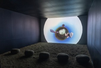 포레스트 커리큘럼은 남아시아와 동남아시아를 잇는 삼림지대 조미아의 자연문화를 통한 인류세 비평을 주로 연구합니다. 작품 유랑하는 베스티아리는 이 연구의 일환으로, 비인간적 존재들이 근대 국민국가에 내재된 계급적이고 세습적인 폭력과 그에 따른 잔재들에 어떻게 대항해왔는지를 보여주는 작품입니다. 좌중을 압도하는 듯한 거대한 깃발들은 위태롭고도 불안하게 스스로를 지탱하고 있는 듯 보입니다. 깃발에는 벤조인이나 아편부터 동아시아 신화에 등장하는 동물들까지 비인간 존재들을 상징하는 대상들이 그려져 있습니다. 각 깃발들은 비인간적 존재들의 대표자로서 모두가 한데 결합되어 아상블라주 그 자체를 표상합니다. 또한 깃발들과 함께 설치된 사운드 작품은 방콕과 파주에서 채집된 고음역대의 풀벌레 소리, 인도네시아의 경주용 비둘기들의 소리, 지방정부 선거를 앞두고 재정 부패를 유지하기 위한 수단으로 쓰이는 불필요한 공사에서 발생하는 소음, 그리고 위의 소리들을 찾아가는데 사용된 질문들과 조건들을 읽어 내려가는 내레이션으로 이루어져 있습니다.